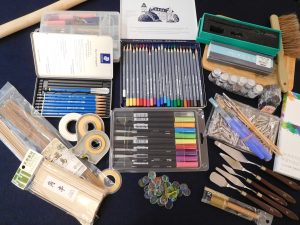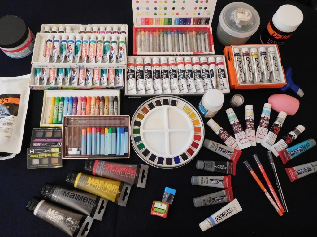 ターナーU-35アクリリック、U-35レギュラージェルメディウム、 ターナーアクリルガッシュ12色、Pebeo水彩絵具24色、Kitpas窓ガラスに描けるクレヨン、ぺんてる水彩パステル12色、ずこうクレヨン極太16色、ミニ鉛筆削り、ターレンスコースパミスメディウム、MAIMERIアクリリックカラー、株式会社GS Mr.ウエザリングライナー、タミヤマスキングテープ、トンボ鉛筆ABT10色水彩マーカー、FABER-CASTELL水彩色鉛筆24色、カラーインクミニボトル、旭陽化学工業株式会社和膠三千本、パレットナイフ、ペン軸・ペン先多数、サンシンズ株式会社珪砂、炭酸石灰、筆各種、「絵具の科学」ホルベイン工業技術部編・中央公論美術出版ほか