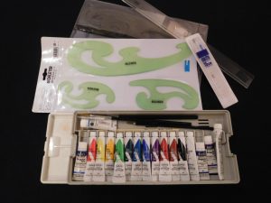 ぺんてるくれよん20色、MARVYアルコールインクマーカー36色、MARVYカラーマーカ―42色、呉竹クリーンカラー80色、サンフレイムジャパン色鉛筆24色、トンボミニ色鉛筆12色、カランダッシュ水彩色鉛筆12色、ユニ水彩色鉛筆12色、DERWENTグラフィック鉛筆、マルマンスケチブック、マルマンアーティストドローイング、雲形定規、ホルベインペーパーパレット、ホルベインアクリルガッシュスクールセット、コッピックスケッチ・チャオ、museポストカードサイズケント紙、漫画原稿用紙A4、ミニ石膏像セット他