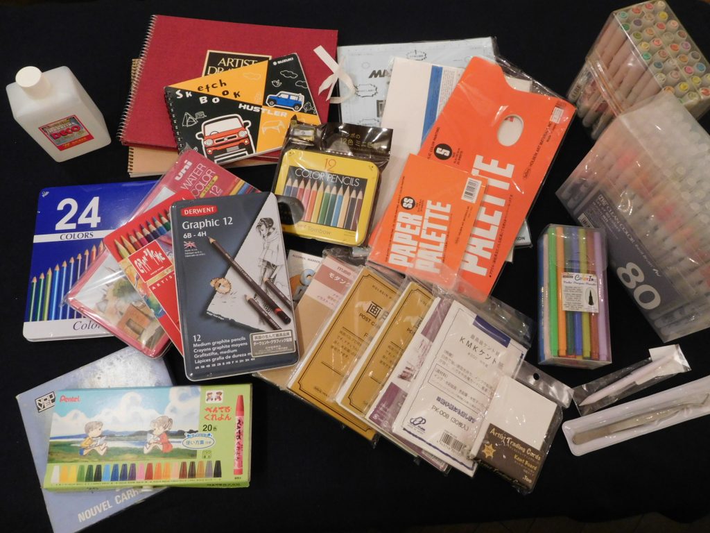 ぺんてるくれよん20色、MARVYアルコールインクマーカー36色、MARVYカラーマーカ―42色、呉竹クリーンカラー80色、サンフレイムジャパン色鉛筆24色、トンボミニ色鉛筆12色、カランダッシュ水彩色鉛筆12色、ユニ水彩色鉛筆12色、DERWENTグラフィック鉛筆、マルマンスケチブック、マルマンアーティストドローイング、雲形定規、ホルベインペーパーパレット、ホルベインアクリルガッシュスクールセット、コッピックスケッチ・チャオ、museポストカードサイズケント紙、漫画原稿用紙A4、ミニ石膏像セット他