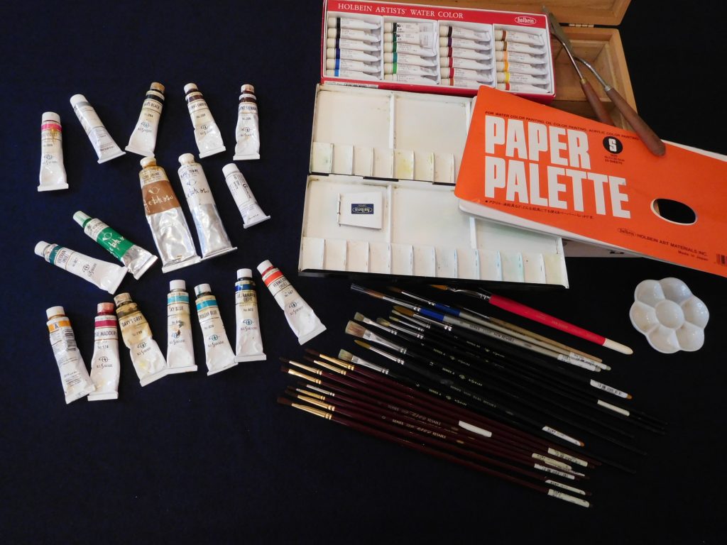 油絵具、筆ほか 画材寄付 2026年1月24日 中央区 Y様 ご寄付を、ありがとうございました。 次の制作者に活用できるよう、お届けいたします。 ■ 寄付内容 クサカベ油絵具、絵具セット木箱、ホルベインアーチストウオーターカラー24色、ペパーパレット、アルミパレット、パレットナイフ、ホルベイン丸筆・平筆各種、クサカベ丸筆・平筆、梅皿