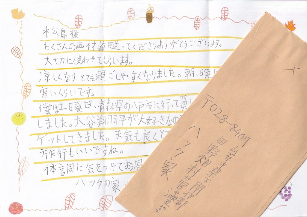ハックの家から 画材寄付 2025年10月21日 田野畑村の「ハックの家」から礼状が届きました。 朝晩の様子と大谷翔平さんのファンでドジャースの帽子をゲットしたことなど、日常が伝わるお手紙です。 10月8日に投函されています。ご報告が少々遅くなりました。 ご寄付の皆様、ありがとうございます。